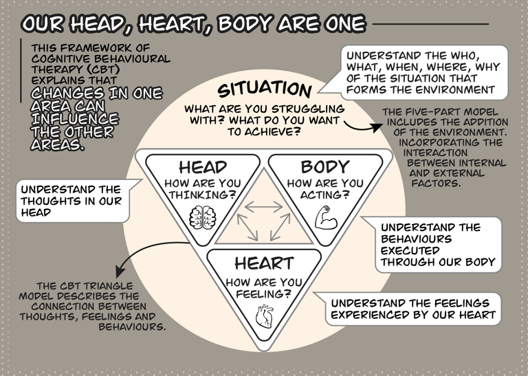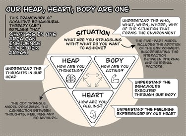 In summary, the CBT Triangle Model and the Five-Part Model offer valuable insights into the interconnectedness of our thoughts, feelings, and behaviors. By becoming more aware of these connections, we can better understand ourselves and take proactive steps to improve our mental well-being. Remember, our head, heart, and body are one—changes in one area can influence the other areas. Nurturing each aspect is key to achieving a balanced and fulfilling life.